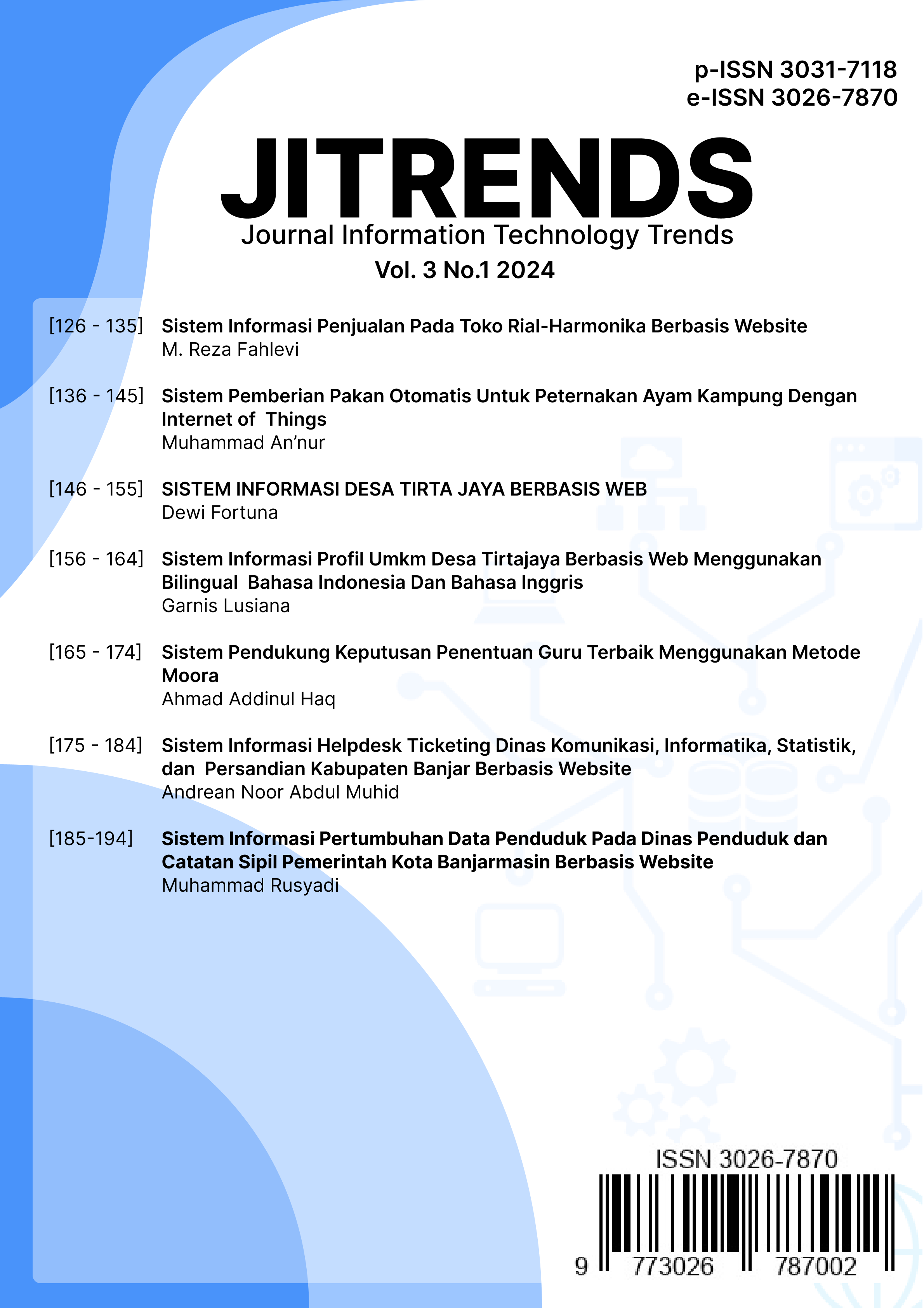 Vol 2 No 01 (2024)JITRENDS (Journal Information Technology Trends) adalah jurnal peer-review yang didedikasikan untuk ide-ide konseptual, studi, dan penelitian di berbagai domain teknologi informasi. Volume 02. No 01 Oktober 2024, jurnal ini mencakup topik-topik seperti Rekayasa Perangkat Lunak, Pemrograman Web, Jaringan Komputer dan Basis Data, Komputasi Seluler, Pengolahan Gambar, Komputasi Awan, Kecerdasan Buatan, Penambangan Data, Sistem Pendukung Keputusan, dan Internet of Things.